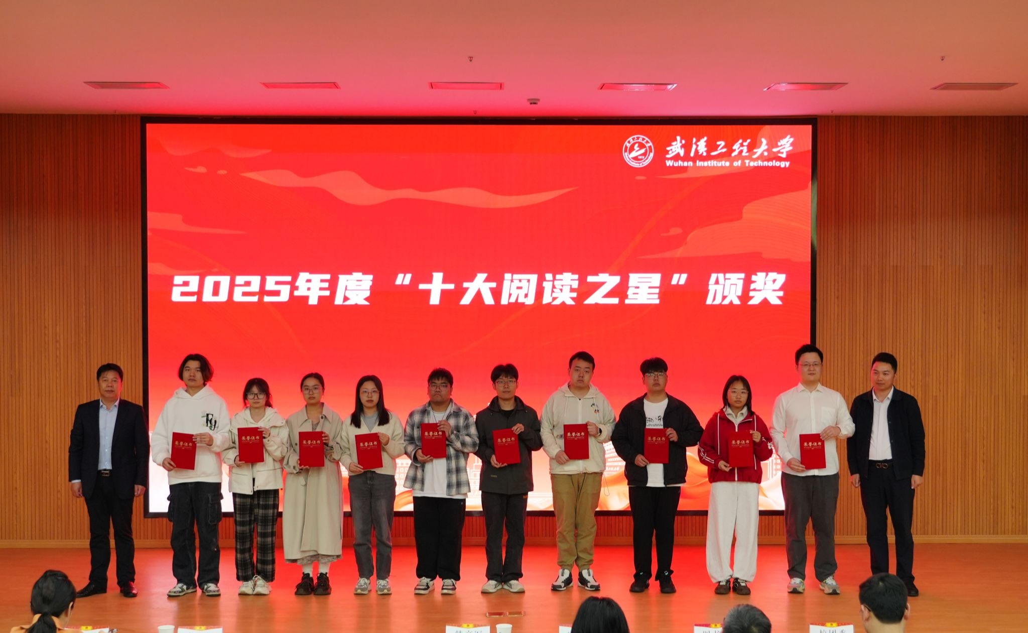 图书馆根据2025年度学生图书借阅频次、阅读活动参与情况及日常学习表现,评选出10位“十大阅读之星”。中国科学报社湖北记者站站长李思辉、校党委常委、宣传部部长韩高军共同为获奖同学颁发证书。