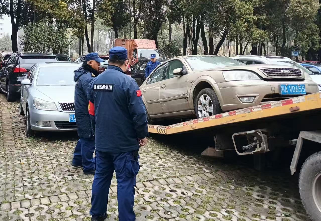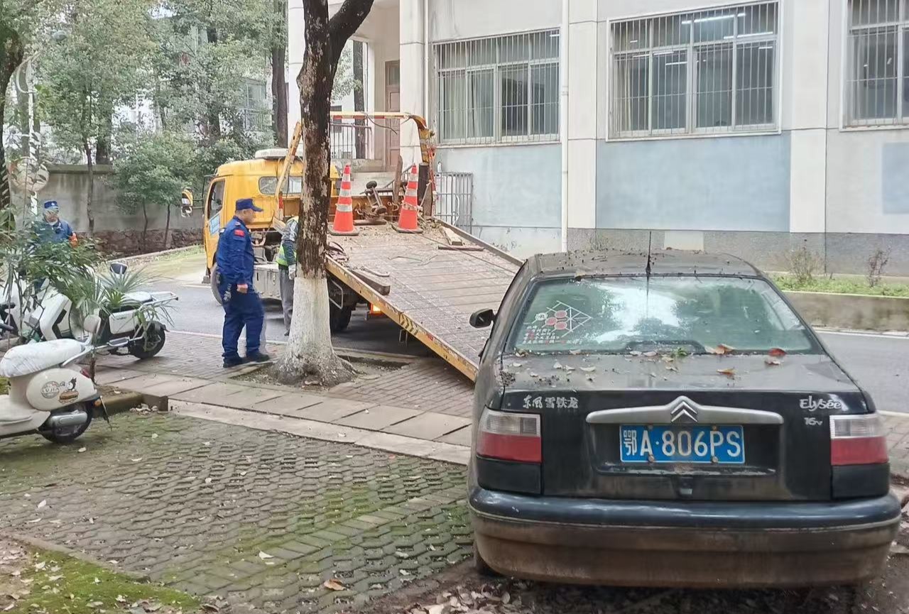 2026年3月19日上午,保卫处工作人员联系专业清拖团队,对拟清理的废弃机动车,由专业拖车统一拖移至武昌校区老二教北侧的停车场集中存放,以便车主后续认领并按相关规定处理。