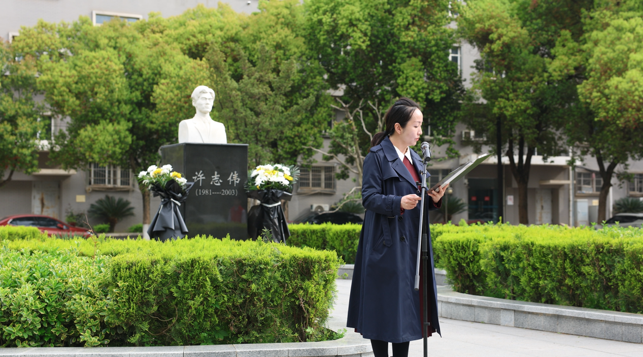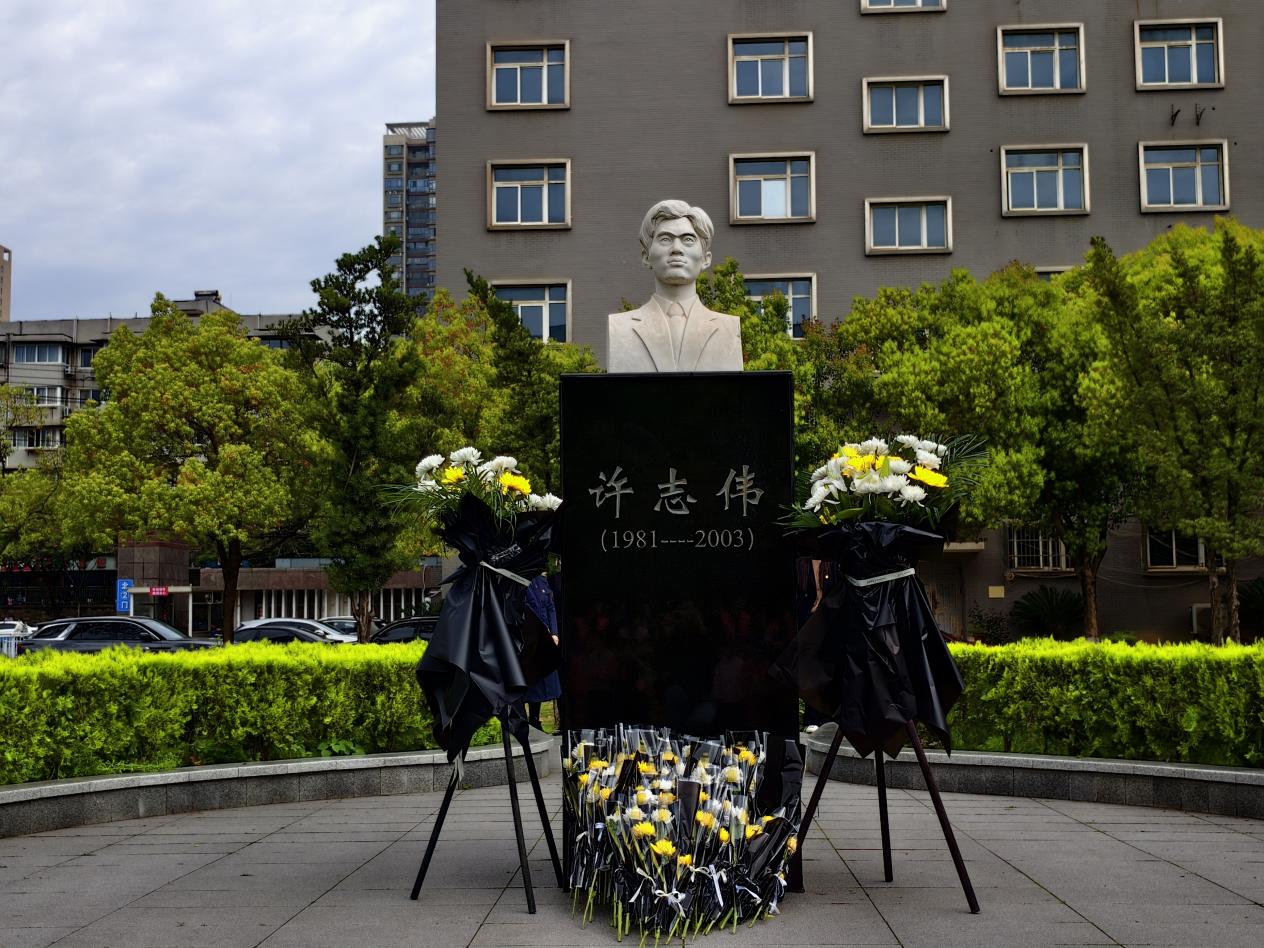 活动中,许志伟党员先锋队、许志伟志愿服务队学生代表为许志伟雕像敬献花篮。全体师生代表面向许志伟雕像肃穆伫立行默哀礼。