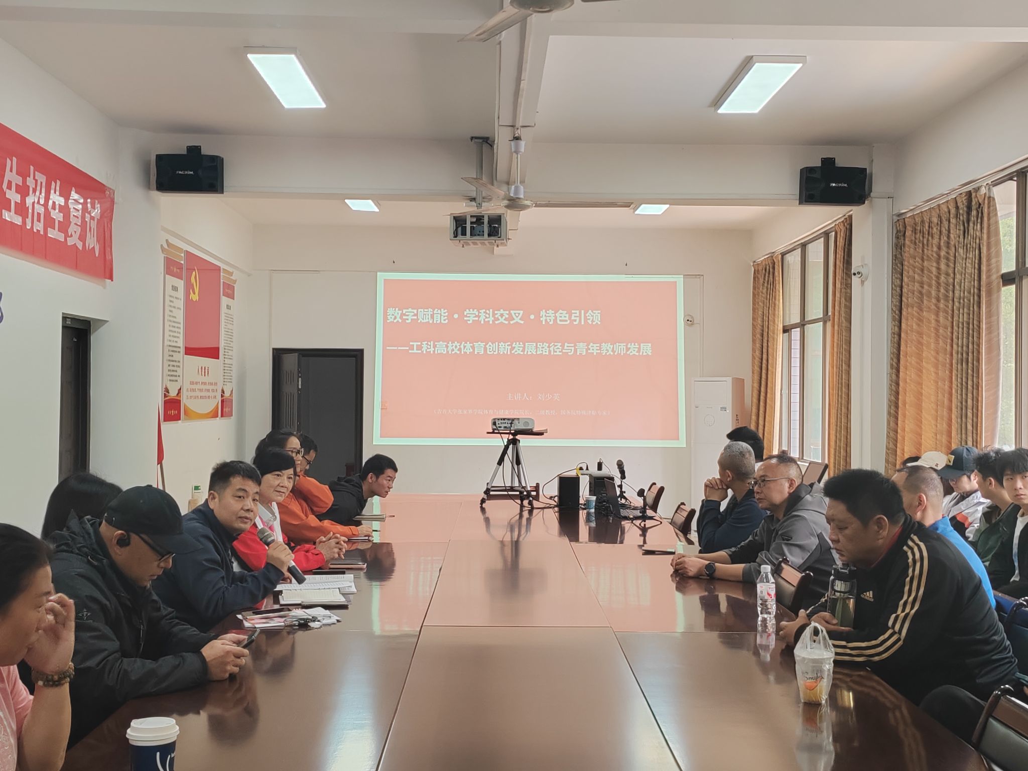 本网讯(通讯员 陈琰)4月16日上午,体育部第十三届“工大学术周”首场专家讲座在体育部二楼会议室201顺利举行。本次讲座特邀吉首大学张家界学院体育与健康学院院长、二级教授、博士生导师刘少英主讲,主题为数智赋能·学科交叉·特色引领——工科高校体育科研创新路径与青年教师发展。体育部副主任贺新家主持活动,体育部全体教师、体育经济管理专业研究生及热爱体育文化的本科生到场聆听学习。