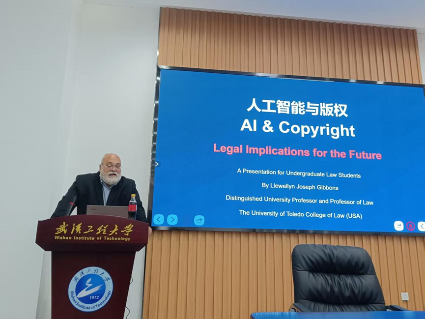 Llewellyn Joseph Gibbons教授现任托力多大学法学院杰出教授、荣誉退休教授,拥有天普大学法学硕士、东北大学法律博士学位,长期从事版权、商标、网络法及国际知识产权教学、研究与法律实务。据不完全统计,其累计出版专著10余部、学术论文30余篇,并担任美国法律协会(ALI)成员、美国律师基金会会士及多家期刊编委。他曾多次来华讲学,两度荣获富布赖特学者称号,并受聘为中南财经政法大学“文澜学者”讲座教授。其丰富的跨国教学、仲裁及文化产业咨询经验,使此次讲座兼具国际视野与本土关怀,为武汉工程大学知识产权学科师生带来了一场思想盛宴。(审稿 陈朝娟 桂展鹏)