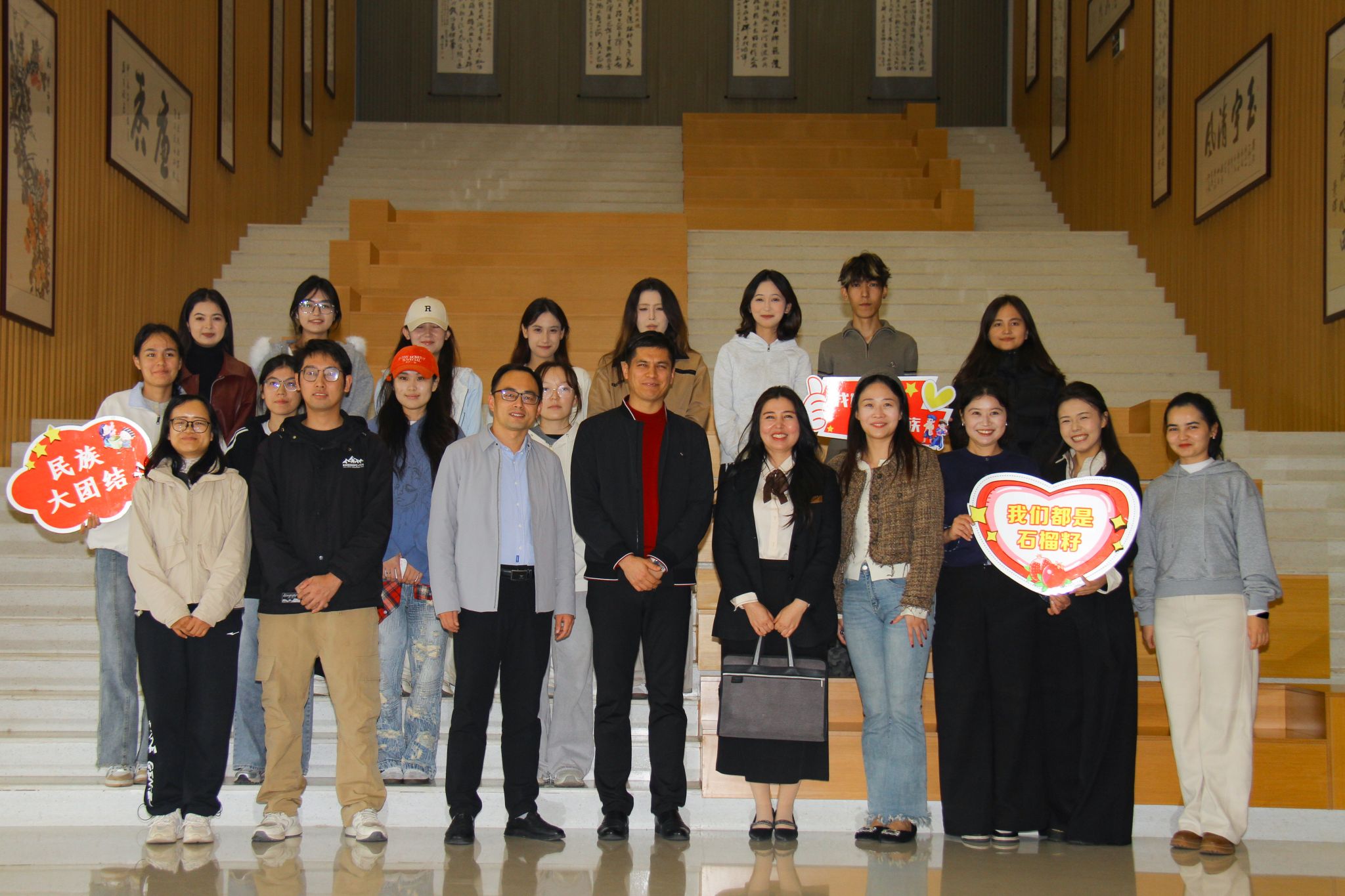 会上,3位新疆籍学生代表分别分享了他们的成长故事。管理学院美茹叶提·热莞别克通过参与文体活动与学生工作,积极搭建民族文化交流平台;管理学院热孜万古丽·阿不都休克尔以“一口团圆锅”的故事为引,倡导传承民族团结精神;法商学院宝力德巴图·帕玛则感恩学校在学业、生活与社会实践中的全方位支持,立志返乡投身基层法治建设。