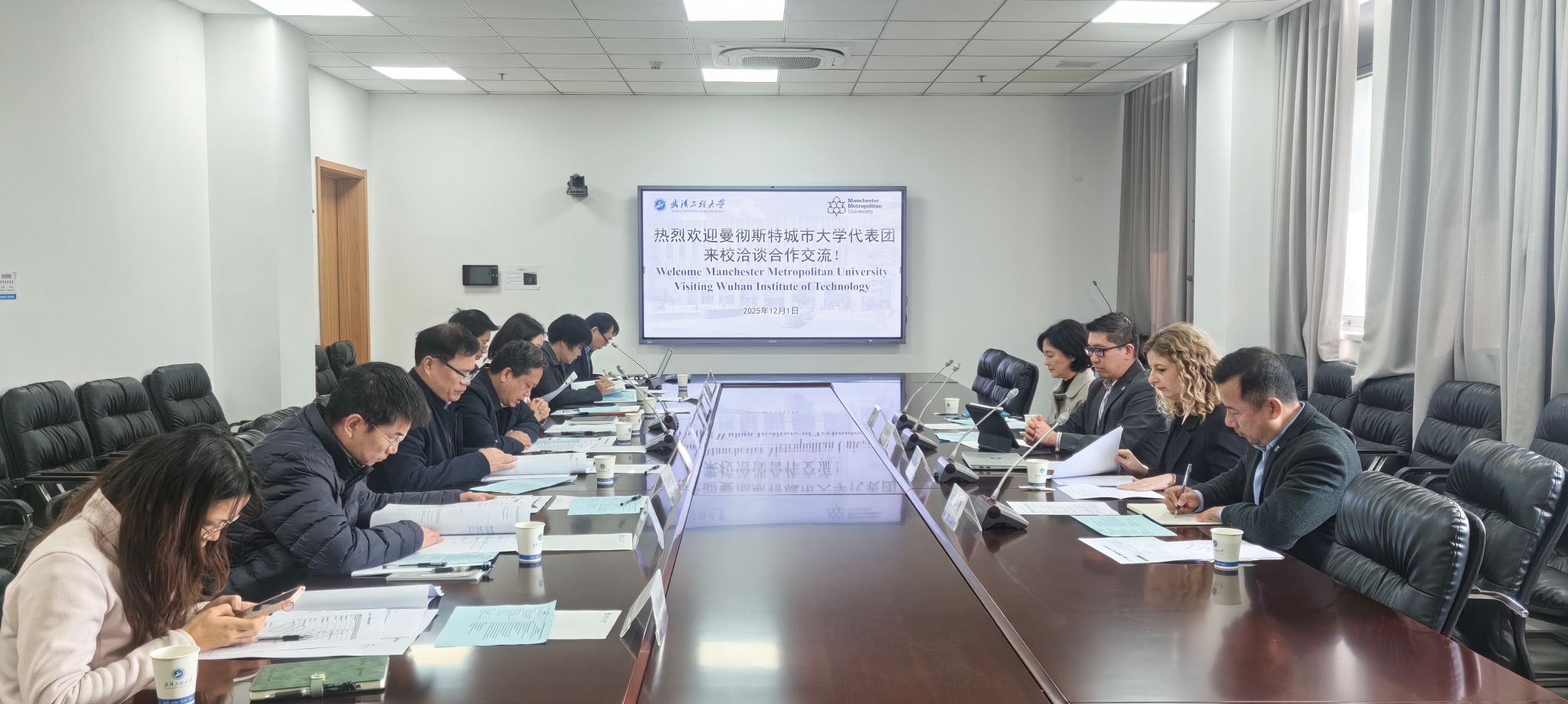 本网讯(通讯员 凌晨)12月1日上午,英国曼彻斯特城市大学(Manchester Metropolitan University)科学工程部代表团一行四人到访我校。校党委常委、副校长吴云韬召开两校教学科研合作专题研讨会,与英方深入磋商。会议由国际交流合作中心主任杜春丽主持,本科生院、材料科学与工程学院、光电信息与能源工程学院(数理学院)、电气信息学院、机电工程学院的相关领导和工作人员出席会议并参与交流。