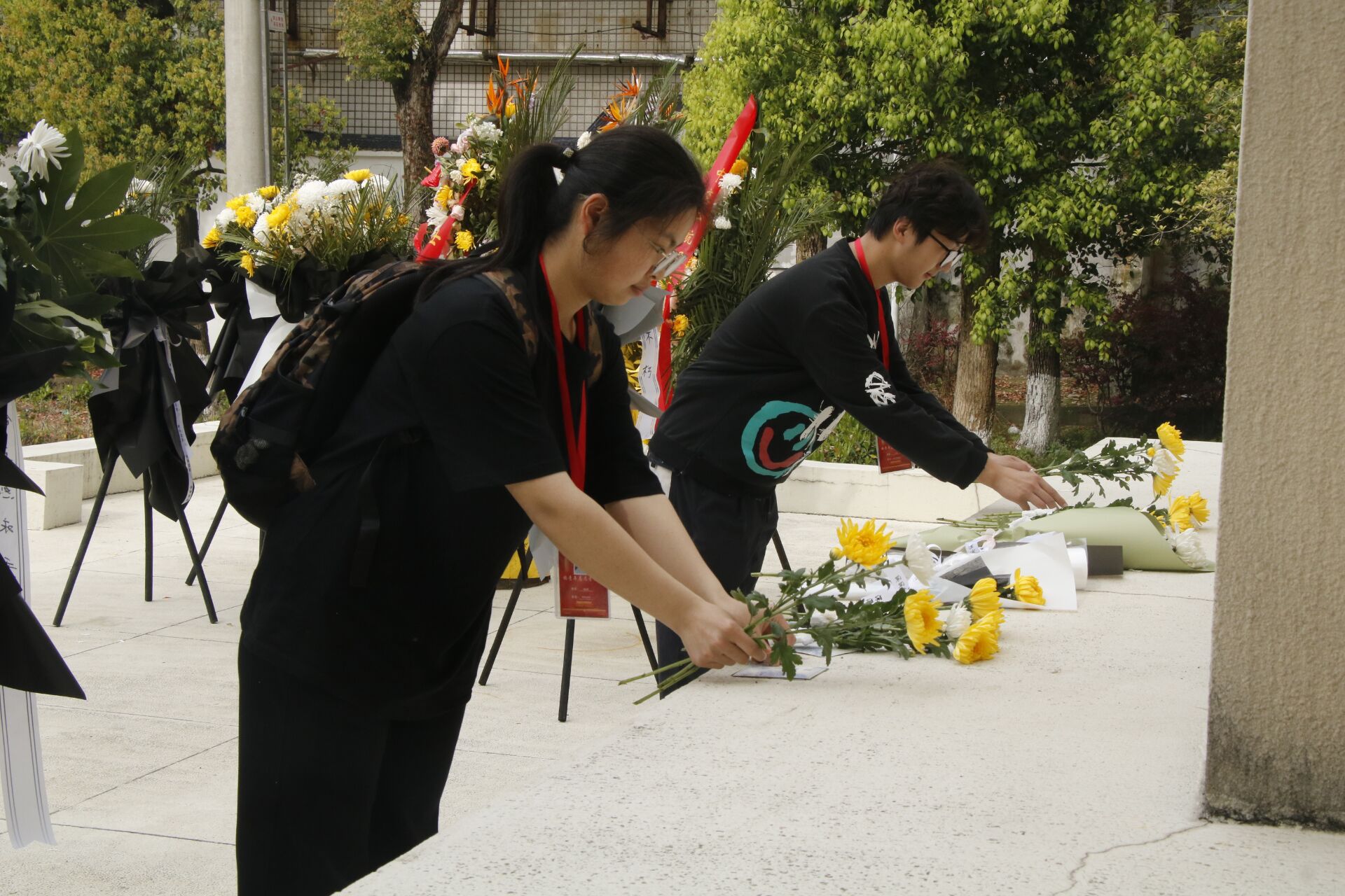 随后,大家依次献上手中的菊花与手写悼念卡片。卡片上,有志愿者写道:“山河无恙,吾辈自强”“您的名字无人知晓,您的功勋永垂不朽”“请放心,强国有我”。一朵朵菊花、一句句寄语,寄托着青年一代对英烈的无限哀思。献花完毕,全体再次集体默哀,沉静的氛围中饱含着对先烈的深切追念。最后,志愿者代表领诵悼词,全体齐声诵读:“青山埋忠骨,史册载功勋。革命先烈,浩气长存……”朴素而庄重的声音在陵园中久久回荡。