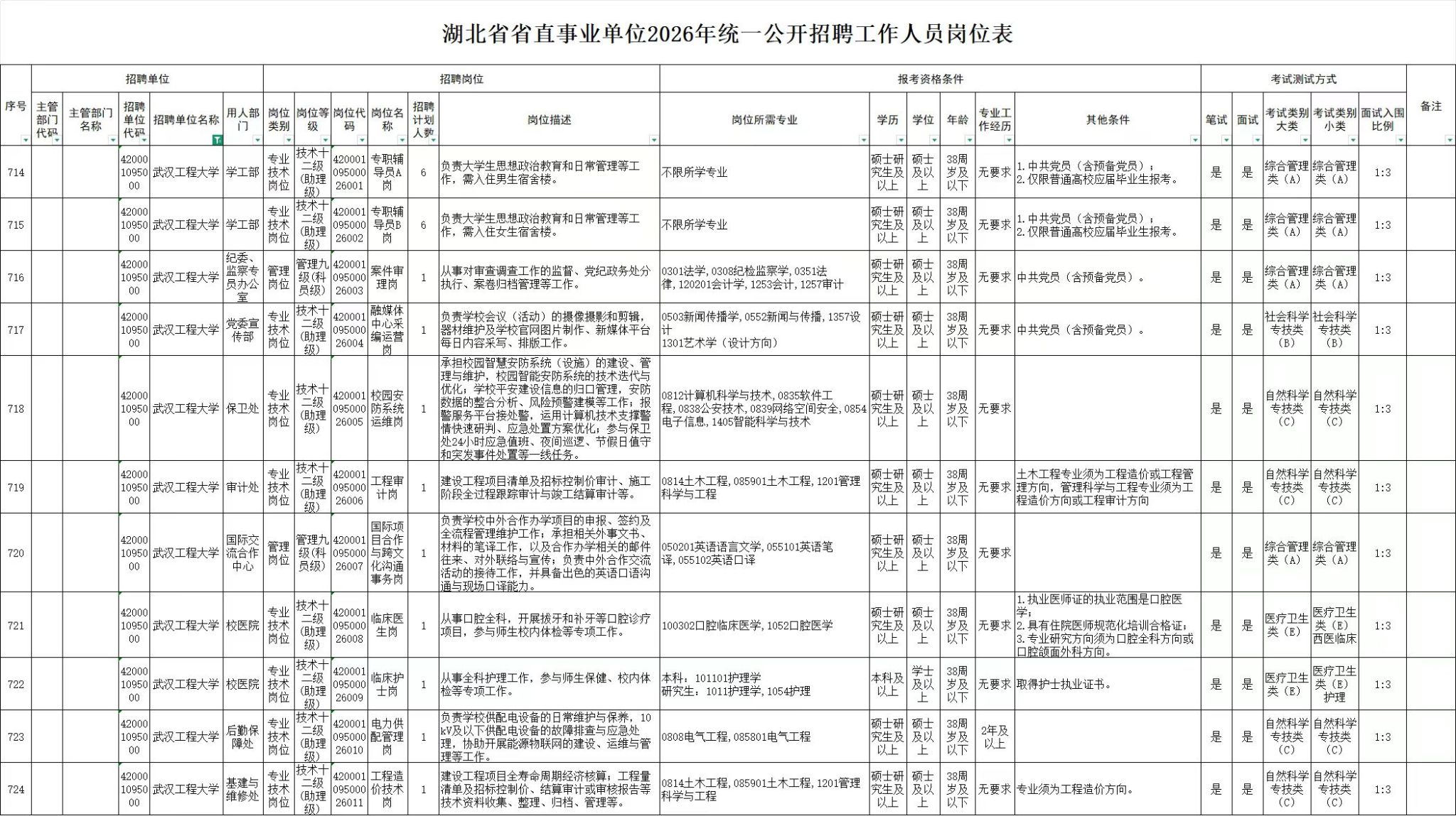 武汉工程大学创建于1972年,原名湖北化工石油学院,隶属湖北省。1980年更名为武汉化工学院,改由原化工部主管。1998年划转到湖北省管理,实行中央与地方共建,以湖北省管理为主。2006年更名为武汉工程大学。学校是一所以工为主,覆盖工、理、管、经、文、法、艺术、医学、教育学九大学科门类的多科性教学研究型大学,是湖北省重点建设高校,是湖北省“一流学科”培育建设高校。为满足工作需要,武汉工程大学2026年拟面向社会公开招聘21名工作人员,现将有关事项公告如下: