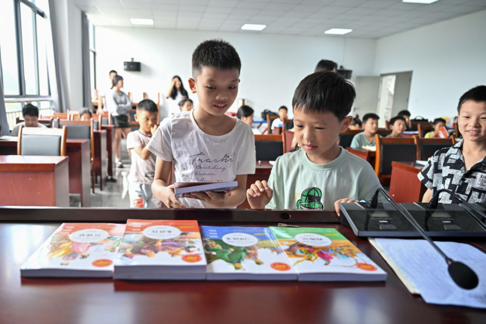 ↑暑期学堂托管班的孩子们在领取湖北民族大学志愿者赠送的绘本书籍