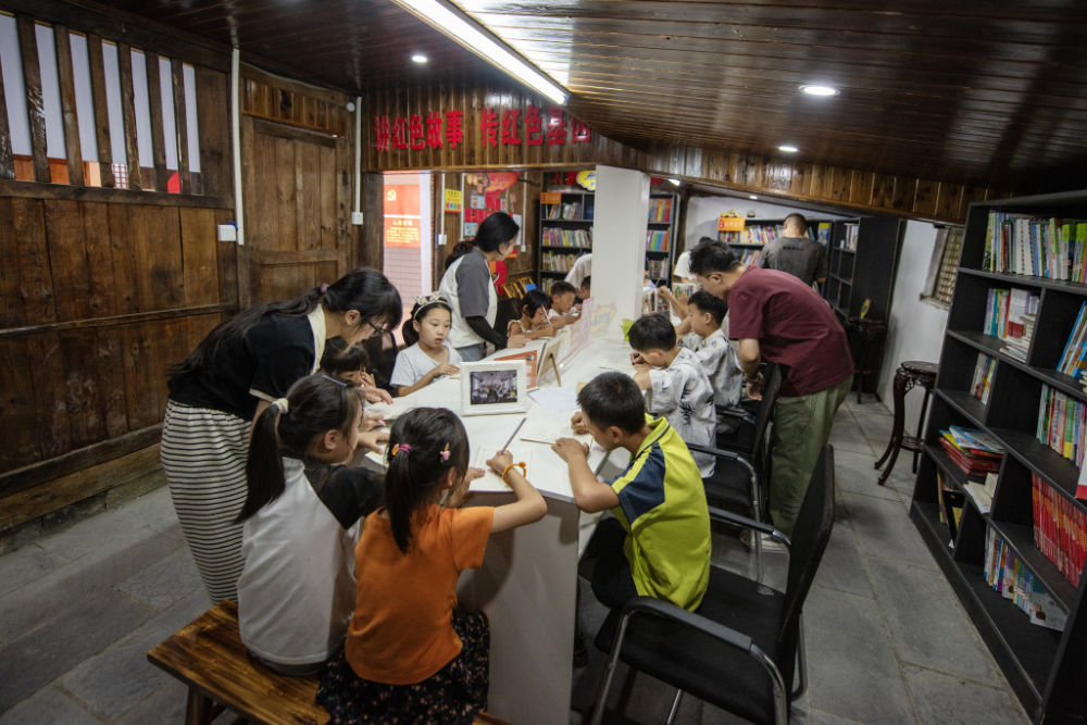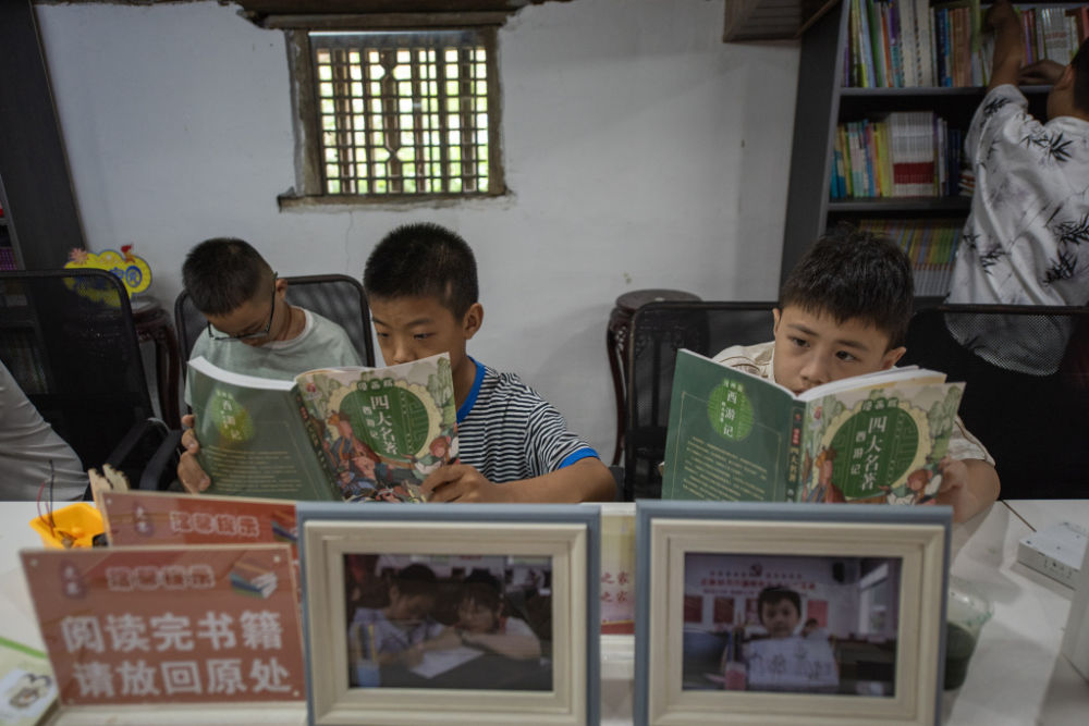 ↑暑期学堂托管班的孩子们在阅读文学绘本