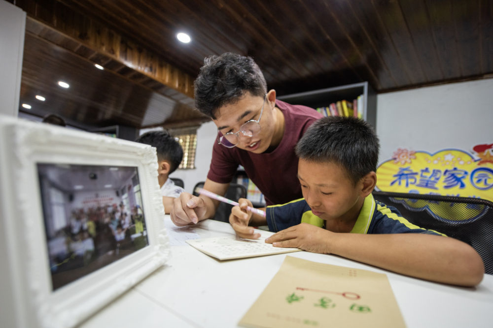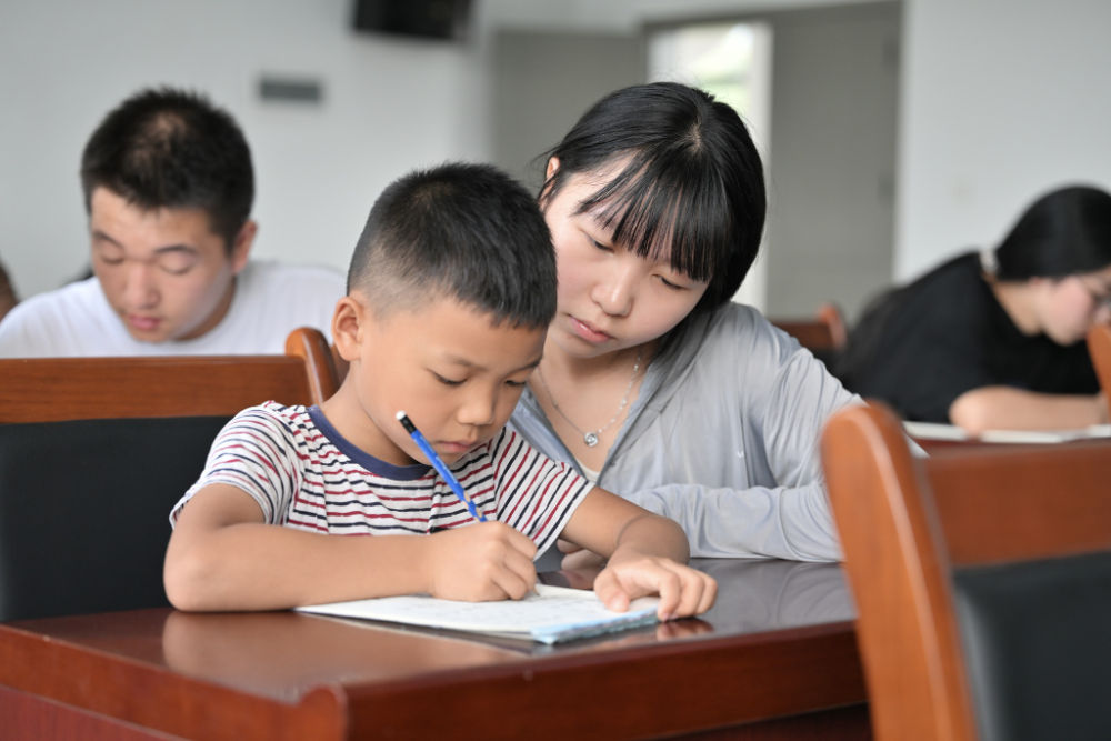 ↑来自湖北民族大学的志愿者在辅导孩子练习书写