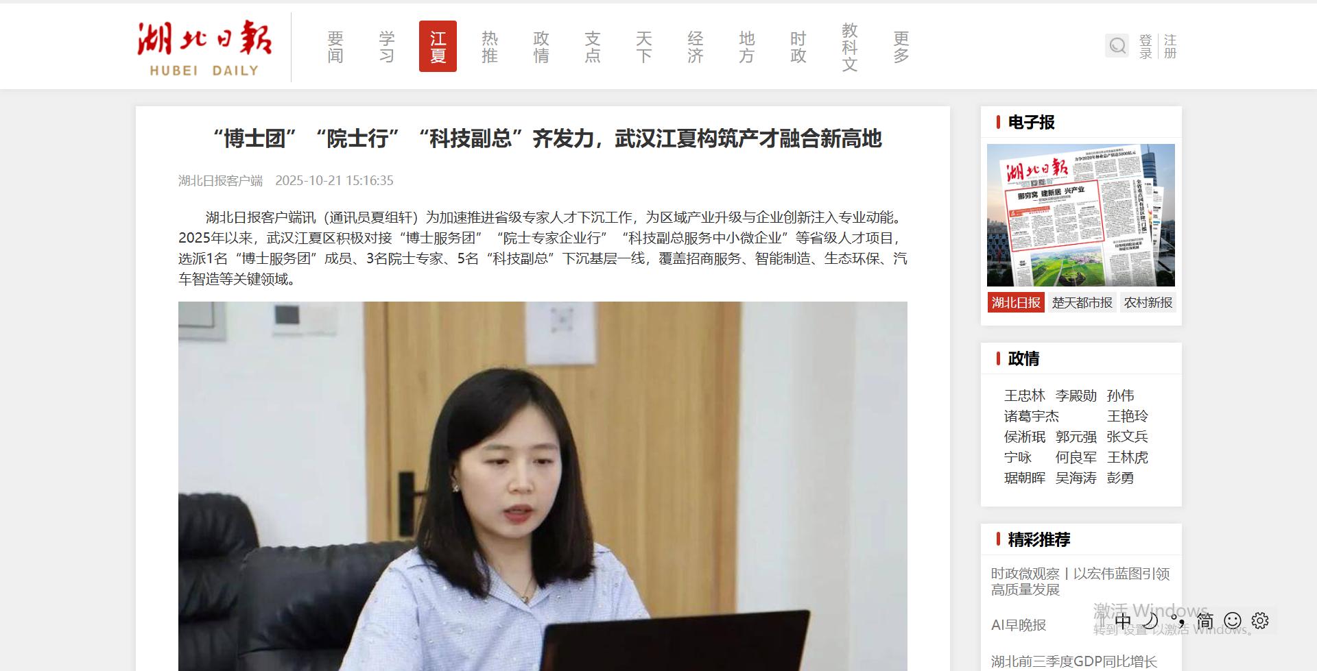 “科技副总”驻企赋能,破解企业创新痛点。中国地质大学(武汉)郑世祺教授驻点武汉华大新型电机科技股份有限公司,针对伺服电机高响应、振动抑制等难点提出新控制策略,优化电机性能;华中农业大学张纾副教授在武汉华锐源科技有限公司,设计工业设备自动校验装置识别系统,解决人工校验效率低、数据难追溯问题;武汉工程大学张明副教授助力武汉客车制造股份有限公司,融合物联网、AI算法与数字孪生技术,推动企业制造体系向“智能决策+敏捷执行”升级。