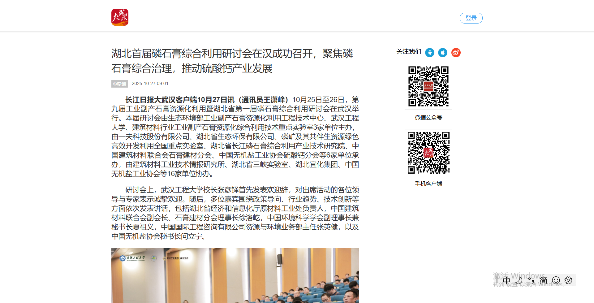 一位与会专家表示:“我们不仅要解决存量磷石膏的治理问题,更要前瞻布局硫酸钙新材料产业链,把‘废料’变成‘原料’,把‘负担’转化为‘资源’。”此次会议标志着我国在工业副产石膏资源化利用方面迈出更加务实而创新的一步,为湖北省乃至长江经济带的磷石膏治理与绿色产业发展探索出更多可行路径。
