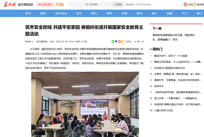 长江网讯(通讯员张纪元 徐琲) 筑牢安全防线 共建平安家园佛祖岭街道开展国家安全教育主题活动为进一步增强社区工作人员及物业从业人员的国家安全意识、应急处置能力和反诈防骗水平,4月7日,佛祖岭街道金融港社区联合武汉工程大学光能数理学院,共同开展了以“筑牢安全防线,共建平安家园”为主题的国家安全教育活动。15名大学生志愿者以“知识宣讲+承诺践行”的形式,将政治安全、网络安全等内容融入实操演练,有效提升了基层安全防护能力,筑牢了社区安全防线。
