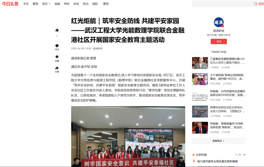 为迎接第十一个全民国家安全教育日,深入学习贯彻总体国家安全观, 4月7日,武汉工程大学光电信息与能源工程学院(数理学院)联合金融港社区党群服务中心,开展了“筑牢安全防线 共建平安家园”全民国家安全教育日主题活动。辖区3家物业单位工作人员及社区工作者共30余人参加。学院徐琲老师带领15名“理学先锋”党员志愿服务队队员,通过保密宣讲、承诺践诺、入户宣传等形式,推动国家安全教育走深走实,筑牢基层安全防护屏障。