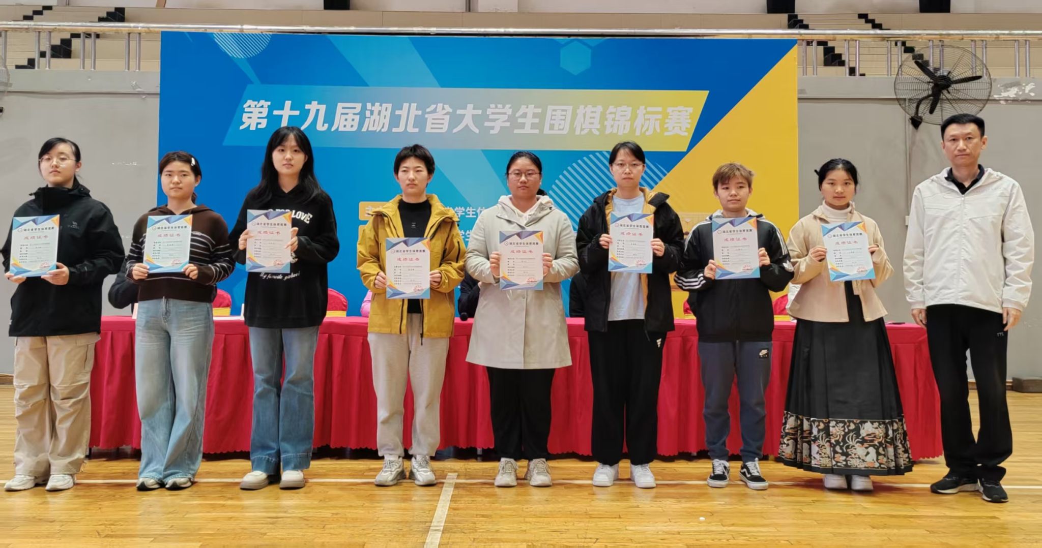 我校围棋队在领队万莉莉,教练员乐建军、吴刚两位老师的带领下,经过两天激烈角逐,最终获得男子团体第七名、混合双人第三名的优异成绩。(审稿 万莉莉)