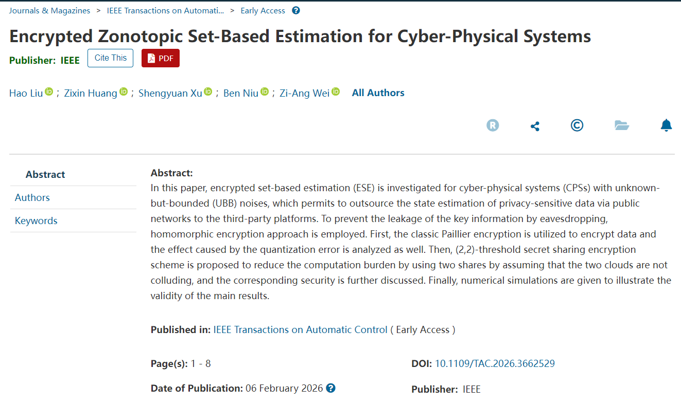本网讯(通讯员 朱丽娜)近日,电气信息学院教师刘皓研究成果被自动控制领域国际Top期刊《IEEE Transactions on Automatic Control》录用。该期刊是IEEE控制系统学会的旗舰汇刊,创刊于1956年,致力于发表系统与控制领域的基础理论、设计与应用方面的高水平论文,被公认为国际控制与自动化领域的顶级期刊之一,同时也是中科院Top期刊,是衡量各高校系统与控制领域学术水准的标志性期刊。